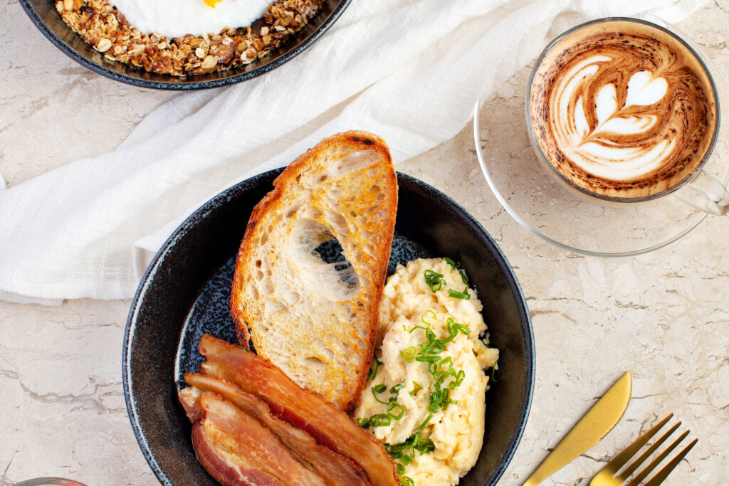 1 ovos mexidos e pão de fermentação natural;