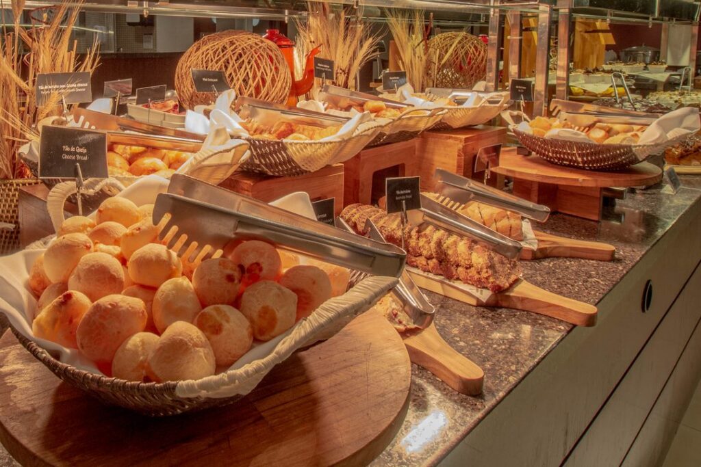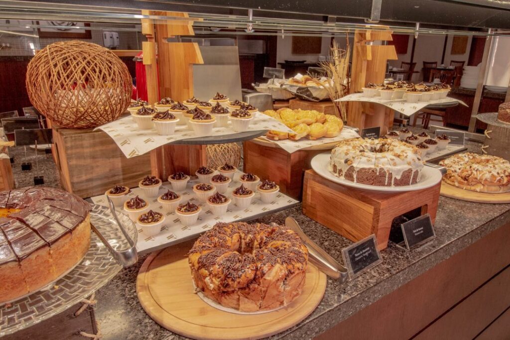 • Itens regionais brasileiros como bolo Luís Felipe, cucas de diversos sabores, pão de queijo, smoothie de açaí, bolo mané pelado;